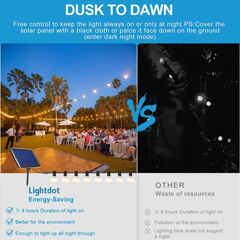 - ★ DUSK to DAWN FEATURE : Photocell sensor turns the bulb on at night and shuts it off during the day. Perfect for outdoor string solar light.